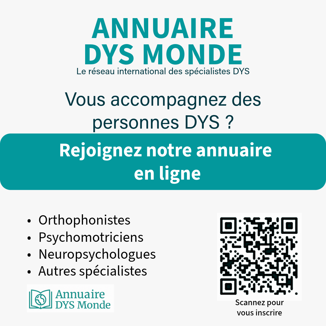 Vous pouvez transmettre ces flyers à vos collègues ou réseaux professionnels afin de soutenir l’Annuaire DYS Monde.